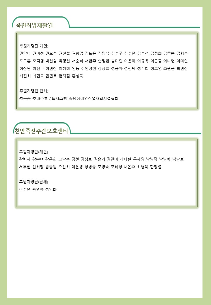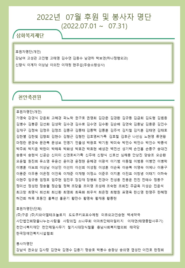2022년 07월 사회복지법인 삼화복지재단 및 산하시설 후원금 수입·세출내역 및 후원자 명단 공고 페이지 정보 작성자 운영자 작성일22-08-08 19:01 조회7,871회 댓글0건 이전글 다음글 목록 본문 2022년 07월 사회복지법인 삼화복지재단 및 산하시설 후원금 수입·세출내역 및 후원자 명단 공고 2022년 07월 후원해 주신 모든 분들께 감사와 사랑을 전합니다. 댓글목록 등록된 댓글이 없습니다. 이전글 다음글 목록