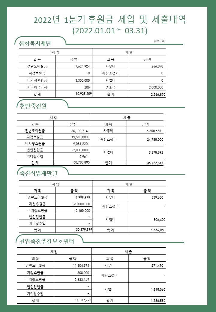 2022년도 1분기 사회복지법인 삼화복지재단 및 산하시설 후원금 수입·세출내역 및 후원자 명단 공고
