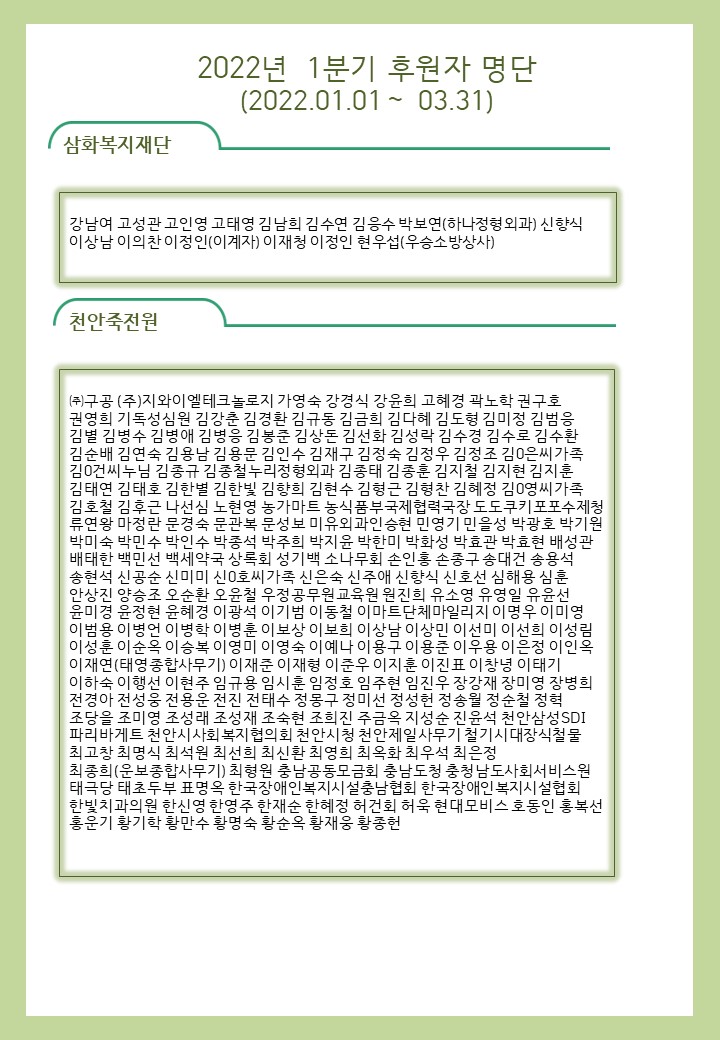 2022년 1분기 후원해 주신 모든 분들께 감사와 사랑을 전합니다.
