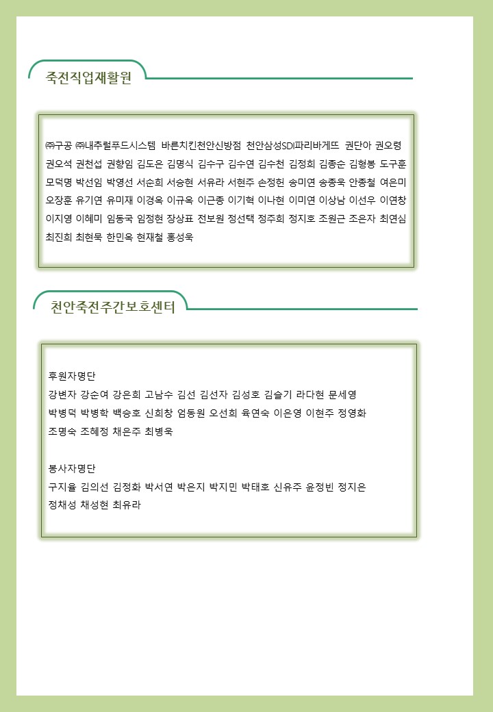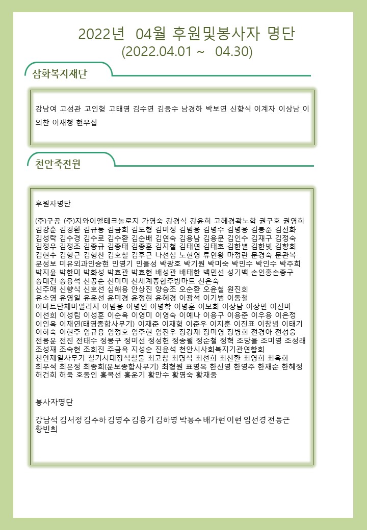 2022년 04월 사회복지법인 삼화복지재단 및 산하시설 후원금 수입·세출내역 및 후원자 명단 공고 페이지 정보 작성자 운영자 작성일22-05-11 09:30 조회8,094회 댓글0건 이전글 다음글 목록 본문 2022년 04월 사회복지법인 삼화복지재단 및 산하시설 후원금 수입·세출내역 및 후원자 명단 공고 2022년 04월 후원해 주신 모든 분들께 감사와 사랑을 전합니다. 댓글목록 등록된 댓글이 없습니다. 이전글 다음글 목록