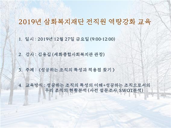삼화복지재단은 소속기관 전 직원의 역량강화를 위해 교육 프로그램을 준비하였습니다.