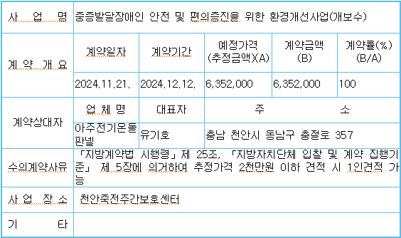 수의계약 내역 공개 페이지 정보 작성자 백승호 작성일24-11-26 13:29 조회3,808회 댓글0건 이전글 다음글 목록 본문 <수의계약 내역 공개> 댓글목록 등록된 댓글이 없습니다. 이전글 다음글 목록