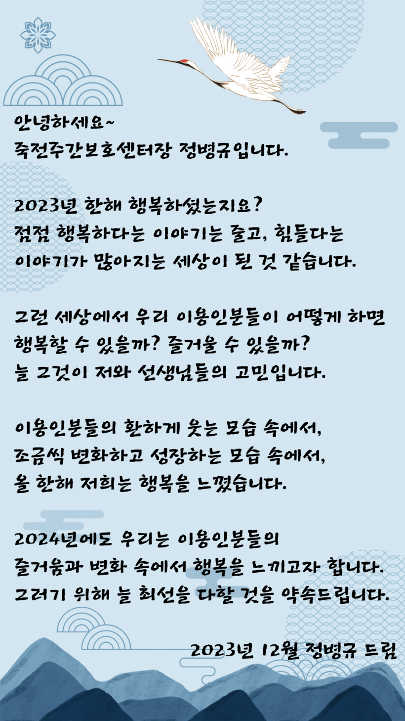 2023년 송년인사 페이지 정보 작성자 김미리 작성일23-12-28 15:41 조회4,712회 댓글0건 이전글 다음글 목록 본문 2023년 한해동안 저희 센터와 함께 해주신 모든 분들께 감사 인사드립니다. 댓글목록 등록된 댓글이 없습니다. 이전글 다음글 목록