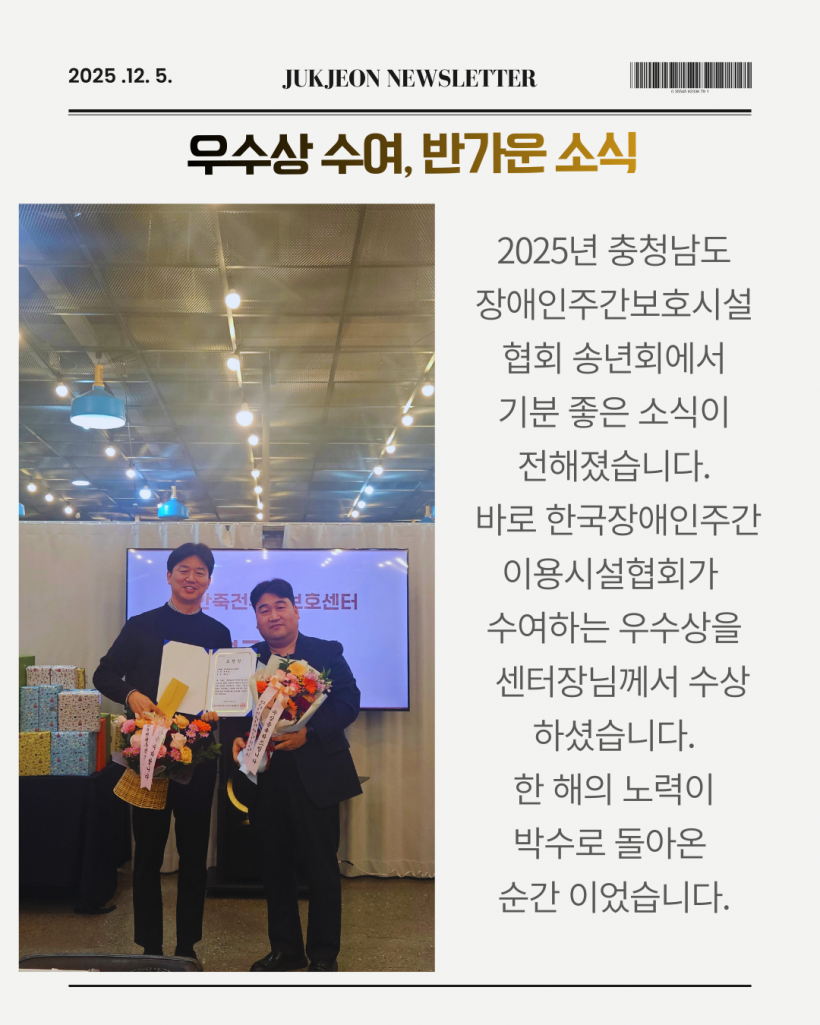 2025년 충청남도장애인주간보호시설협회 송년회에서 기쁜 소식이 전해졌습니다. 한국장애인주간이용시설협회가 수여하는 우수상을 우리 센터 센터장님께서 수상하셨습니다. 이번 수상은 이용인 중심의 운영과 현장을 향한 꾸준한 책임감, 그리고 묵묵히 이어온 리더십의 공로를 공식적으로 인정받은 결과입니다.