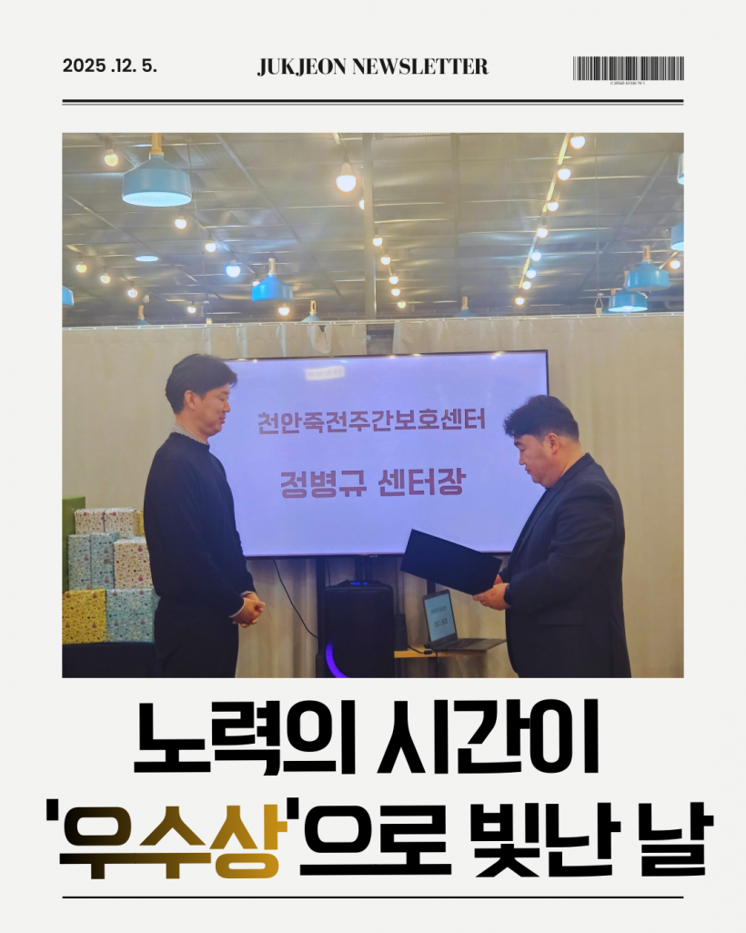 송년회에서는 각 센터의 이야기를 나누는 ‘센터 뽐내기 시간’도 함께 진행되었으며, 센터장님이 걸어온 운영의 방향과 철학이 소개되어 더욱 뜻깊은 시간이 되었습니다. 이번 수상을 계기로 앞으로도 흔들림 없는 운영과 따뜻한 리더십으로 센터의 하루를 지켜가겠습니다. 많은 응원과 관심 부탁드립니다.