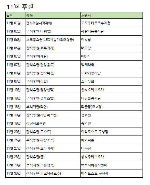[후원] 11월 후원품 페이지 정보 작성자 운영자 작성일24-12-04 11:56 조회884회 댓글0건 관련링크 목록 본문 11월 후원해주신 모든 후원자님께 다시 한번 감사드립니다~! 댓글목록 등록된 댓글이 없습니다. 목록