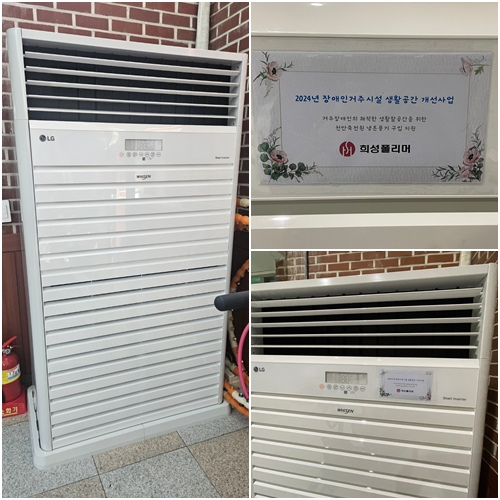 원내에 잔류하는 죽전원 가족들은 하루 중 대부분을 체력증진실에서 음악을 듣거나 원내에서 진행되는 다양한 프로그램에 참여하며 시간을 보내십니다. 체력증진실에서 보내는 시간 동안 여름에는 시원하게, 겨울에는 따뜻하게 보낼 수 있도록 희성폴리머(주)에서 노후화된 냉온풍기를 교체 해주셨습니다