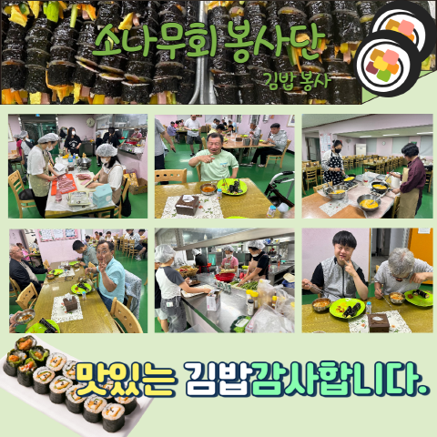 소나무회 김밥봉사 금일 소나무회 김밥봉사자들 오셔서 김밥을 맛있게 만들어주셨습니다.
