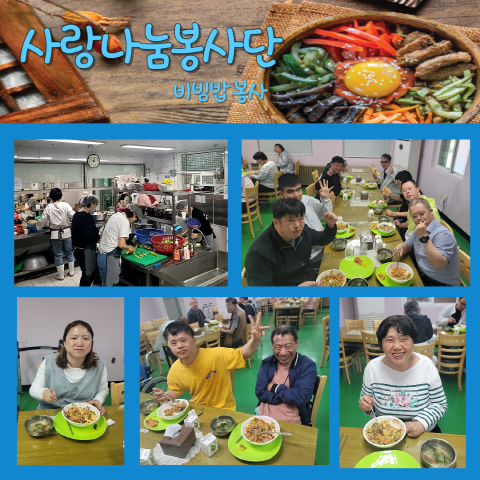 사랑나눔 봉사단이 월 1회 비빔밥 봉사를 위해 천안죽전원에 방문했습니다. 언제먹어도 맛있는 비빔밥!! 죽전원 가족들 모두 좋아하는 비빔밥입니다.