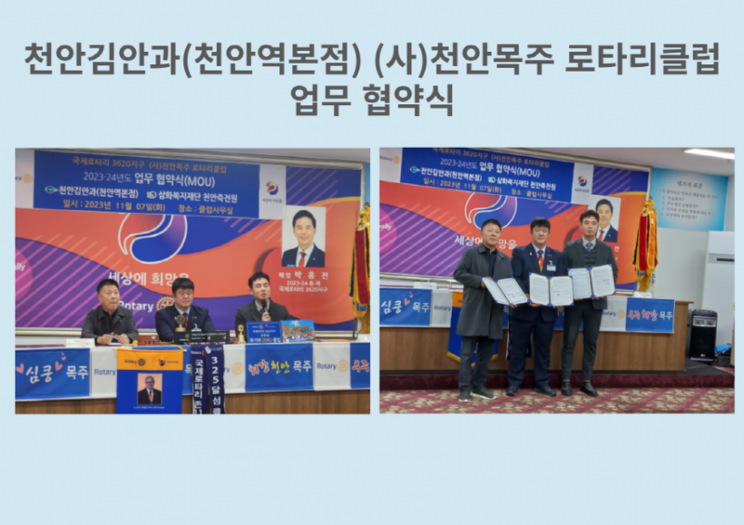 천안김안과(천안역본점) (사)천안목주 로타리클럽 업무협약식 페이지 정보 작성자 운영자 작성일23-11-08 19:30 조회924회 댓글0건 관련링크 목록 본문 23.11.07(화)천안김안과(천안역본점), (사)천안목주 로타리클럽과 업무협약식을 진행하였습니다.본 협약식을 통해 의료지원에 도움이 될 수 있게 되었습니다.다시 한번 감사드립니다. 댓글목록 등록된 댓글이 없습니다. 목록