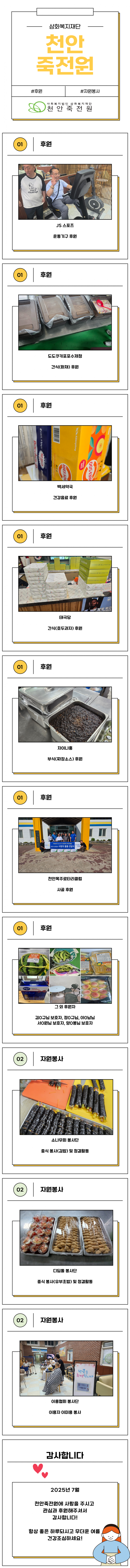 [7월] 후원 자원봉사 페이지 정보 작성자 운영자 작성일25-08-05 11:31 조회738회 댓글0건 관련링크 목록 본문 2025년 07월 한달동안 천안죽전원에 사랑과 나눔을 전달해주신 분들을 소개합니다!항상 감사드리고 많은 관심과 사랑 부탁드립니다! 댓글목록 등록된 댓글이 없습니다. 목록