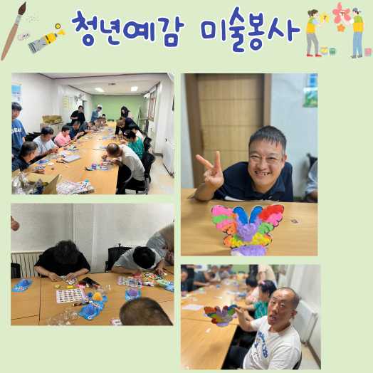 [자원봉사] 청년예감 페이지 정보 작성자 운영자 작성일23-09-19 17:10 조회786회 댓글0건 관련링크 목록 본문 23.09.16(토)청년예감에서 미술봉사를 진행해 주셨습니다.이번 미술 프로그램에서는 폼클레이를 이용하여 작품을 만들었습니다.가족들 모두 행복한 시간을 보냈습니다. 댓글목록 등록된 댓글이 없습니다. 목록
