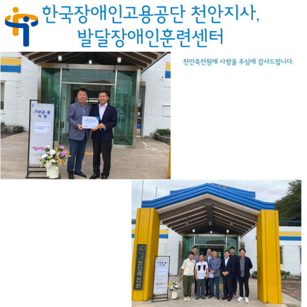 [후원]한국장애인고용공단 천안지사,발달장애인훈련센터 페이지 정보 작성자 운영자 작성일23-09-25 17:27 조회862회 댓글0건 관련링크 목록 본문 23.09.25(월)한국장애인고용공단 천안지사,발달장애인훈련센터에서 후원 방문을 해주셨습니다.다시한번 감사드립니다~! 댓글목록 등록된 댓글이 없습니다. 목록