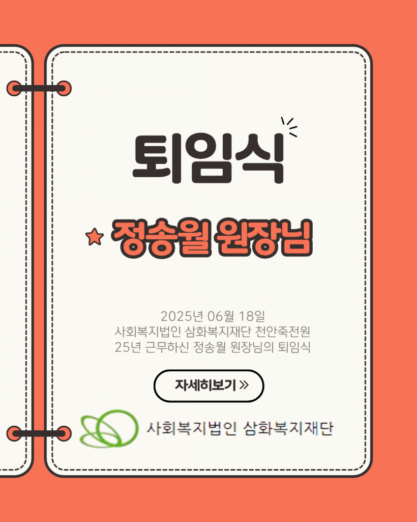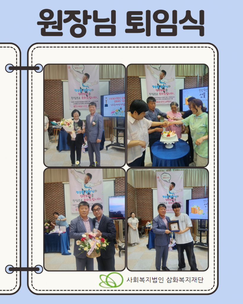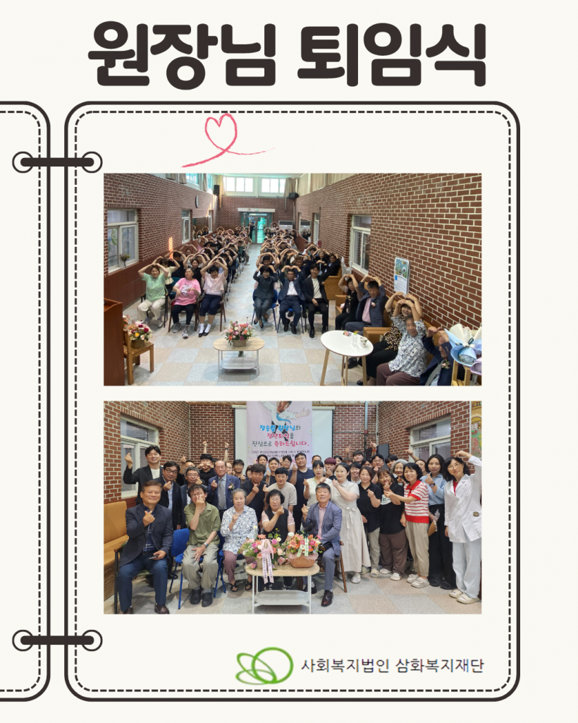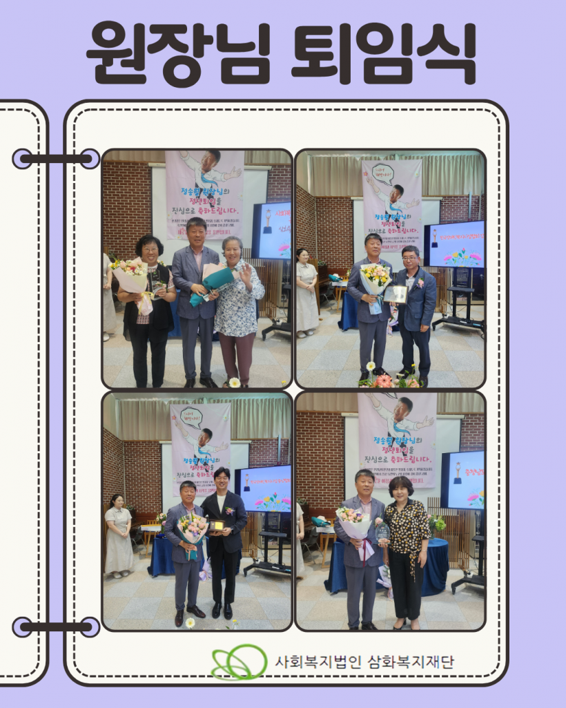 그동안 시설에 헌신해주신 정송월 원장님께 다시한번 감사의 말씀을 드리며 원장님의 새로운 출발을 응원하겠습니다.