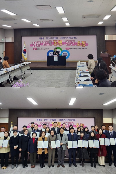 천안시 청룡동(동장 박의용)이 3일 청룡동행복지원센터 회의실에서 천안시기자협회 및 23개 사회복지기관관 지역복지 발전 및 통합사례관를 위한 ‘청룡 함께 행동, 열린 소통’업무협약(MOU)를 체결하였습니다.