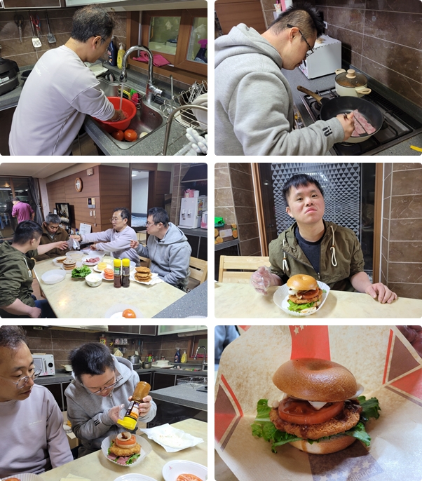 가족분들이 열심히 햄버거를 만드는 모습이 보이시나요?