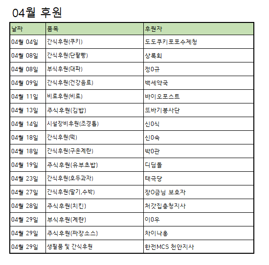 [후원] 4월 후원품 페이지 정보 작성자 운영자 작성일25-05-12 09:45 조회768회 댓글0건 관련링크 목록 본문 25년 04월 후원품 목록입니다.최근 감기, 코로나들이 다시 유행입니다.큰 일교차로 감기가 걸리기 쉬운 날씨입니다.항상 건강에 유념하시고 저희 죽전원에 많은 사랑을 주셔 감사합니다. 댓글목록 등록된 댓글이 없습니다. 목록