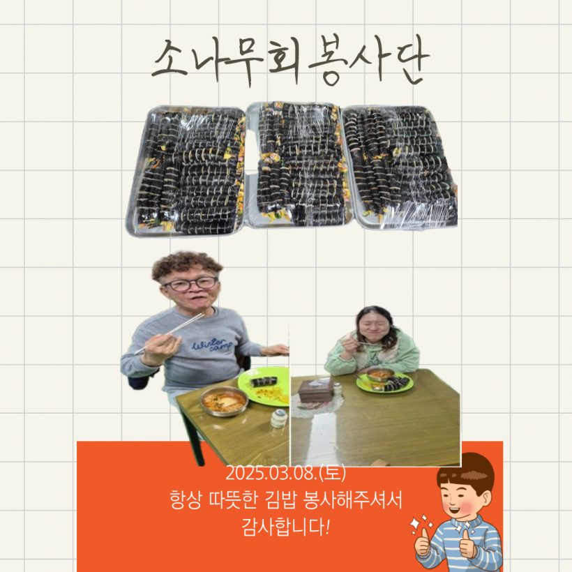 [자원봉사] 소나무회봉사단 페이지 정보 작성자 운영자 작성일25-03-12 13:12 조회697회 댓글0건 관련링크 목록 본문 2025.03.08. 소나무회봉사단에서 김밥봉사 진행해주셨습니다.매월 한번 씩 저희 가족분들에게 맛있는 김밥 봉사해주고 계십니다.항상 감사드립니다. 댓글목록 등록된 댓글이 없습니다. 목록