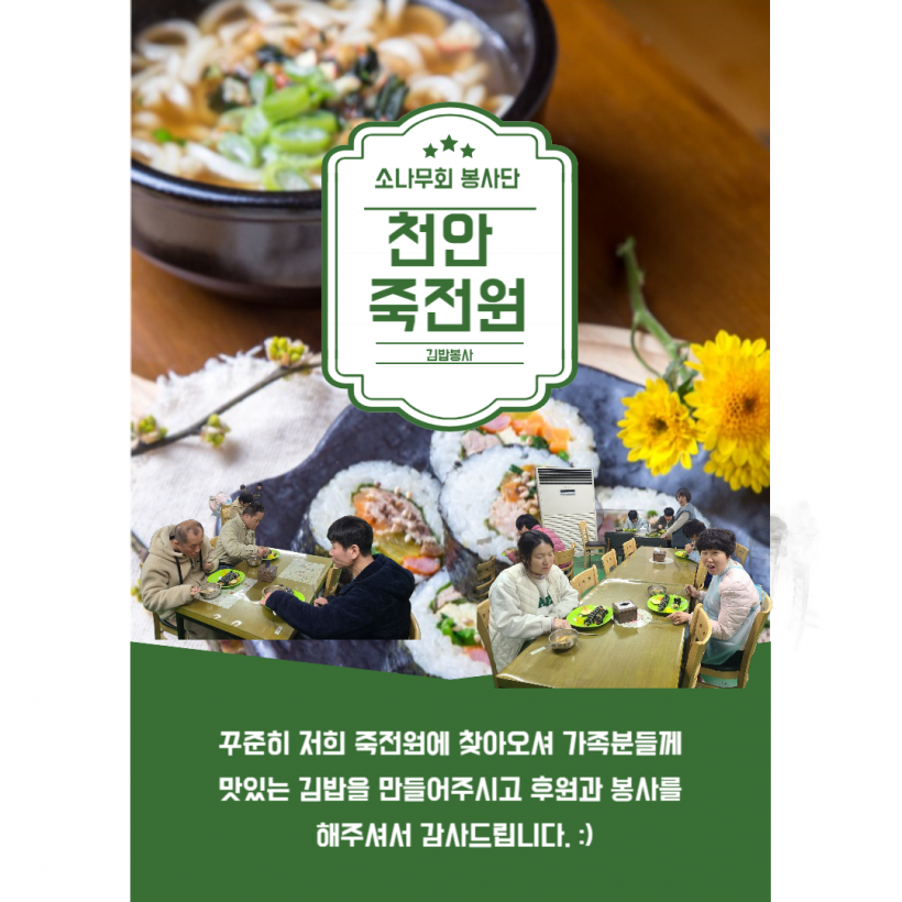 [자원봉사]소나무회봉사단 페이지 정보 작성자 운영자 작성일25-02-05 15:39 조회1,022회 댓글0건 관련링크 목록 본문 25.01.11 25년에도 다시 찾아와주셔서 죽전원 가족분들께 맛있는 김밥을 후원해주시고 봉사해주셨습니다.감사합니다! 댓글목록 등록된 댓글이 없습니다. 목록