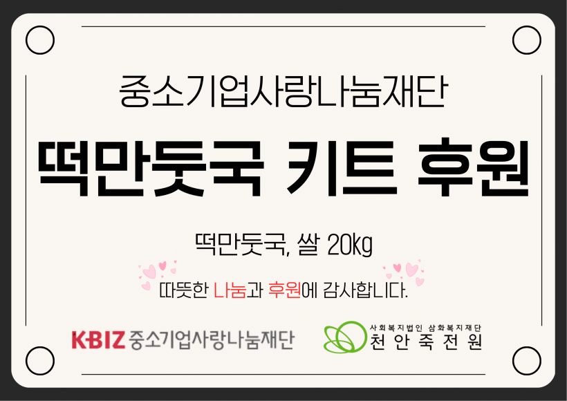중소기업사랑나눔재단 떡만둣국키트, 쌀 후원 페이지 정보 작성자 운영자 작성일26-02-05 13:45 조회268회 댓글0건 관련링크 목록 본문 26.01.28.(수)중소기업사랑나눔재단 떡만둣국키트, 쌀 후원해주셨습니다.가족분들도 환하게 웃으시면서 맛있게 식사 하셨습니다.천안죽전원에게 사랑과 나눔을 해주신 중소기업사랑나눔재단에게 다시한번 감사의 말씀을 드립니다.감사합니다. 댓글목록 등록된 댓글이 없습니다. 목록