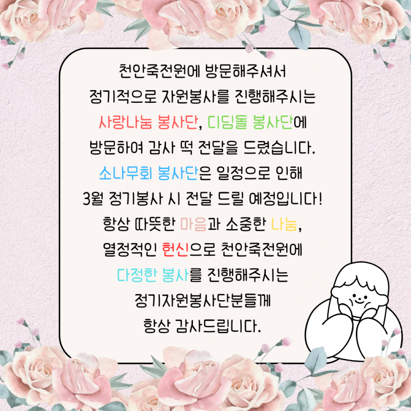 정기자원봉사단 감사 떡 전달 페이지 정보 작성자 운영자 작성일26-02-23 16:50 조회164회 댓글0건 관련링크 목록 본문 26.02.13.(금)설 명절을 앞두고 정기자원봉사단분들께 감사 떡을 전달드리고 왔습니다.이용자분들과 함께 방문하여 감사 인사를 드리고 감사 인사를 드렸습니다.항상 천안죽전원에 다정한 봉사를 진행해주시는 정기자원봉사단분들께다시한번 감사 인사를 드립니다. 댓글목록 등록된 댓글이 없습니다. 목록