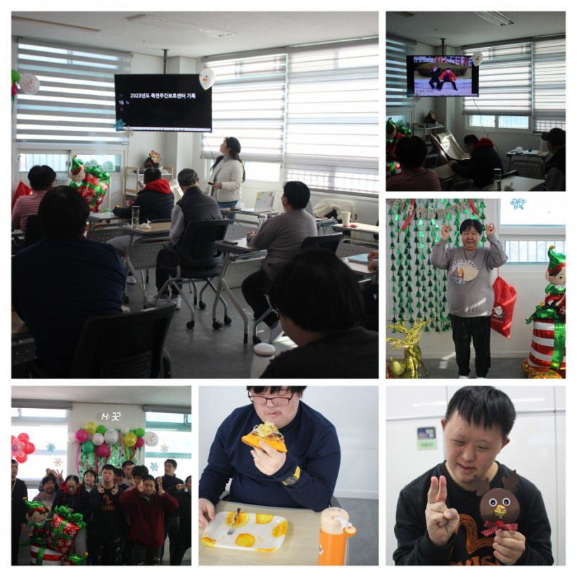 풍선과 현수막으로 생일파티 장식도 하고, 생일자들의 멋진 사진을 동료들과 함께 영상으로 보고, 센터에서 준비한 생일선물도 받으며 생일파티 주인공이 되어 즐겨보는 시간을 가져보았고, 11월 자치회의에서 선정된 간식인 닭강정, 케이크, 샴페인도 동료들과 먹으며 도란 도란 이야기를 나누는 시간을 가져보았습니다.