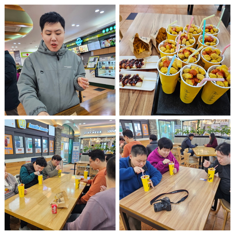 센터에서 멀지 않아 이동 거리도 짧고, 다양한 먹거리와 즐길거리도 많아 이용인들이 흥미와 관심을 가지고 휴게소를 둘러보는 모습을 보였고, 직접 먹고 싶은 간식도 선택해 먹으며 동료들과 도란도란 이야기도 나누었습니다.