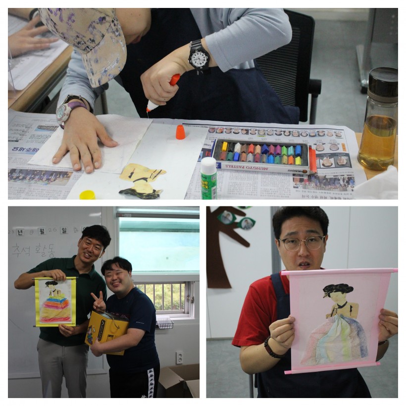 다양한 색의 파스텔과 핸드타올을 이용해 나만의 개성있는 입체적인 한복 치마 꾸미기 활동을 하며, 한복의 아름다움을 다시한번 느낄 수 있었고, 만들기 활동 후에는 센터에서 준비한 추석선물을 전달하는 전달식을 진행하여 풍성한 추석의 분위기를 느껴볼 수 있었습니다.