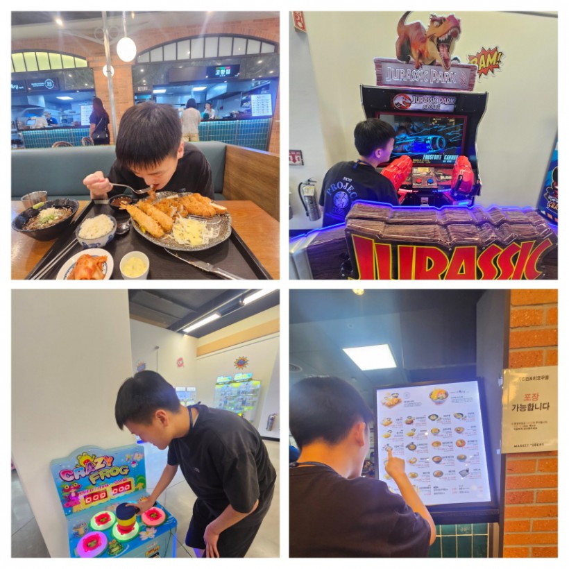 마트로 이동해 다양한 상품을 살펴보며 간식을 직접 선택하고 구매해 보았고, 푸드코트로 이동해 사진을 보며 먹고 싶은 메뉴를 고르고 주문했습니다.