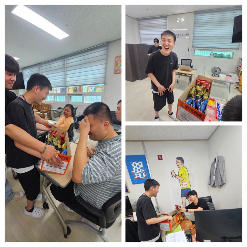 이*현 이용인이 간식을 나누어 주니 동료들이 고맙다고 이야기하자 무척 즐거워하는 모습이 무척 즐거워 하였고, 분위기도 한층 활기찼습니다.