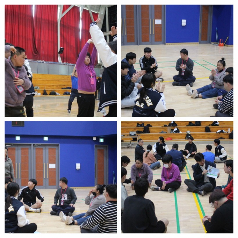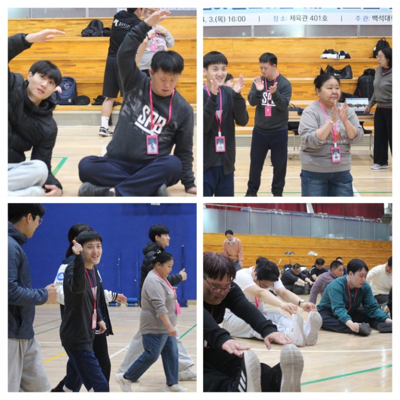 처음만나는 학생들과 반갑게 인사도 하고 간단히 자기소개도 하는 시간을 갖은 후 학생들과 함께하는 운동에 이용인 모두가 설레는 마음으로 임했고, 신나는 음악에 맞춘 스트레칭부터 다양한 게임까지 즐기며 건강한 땀을 흘렸습니다.