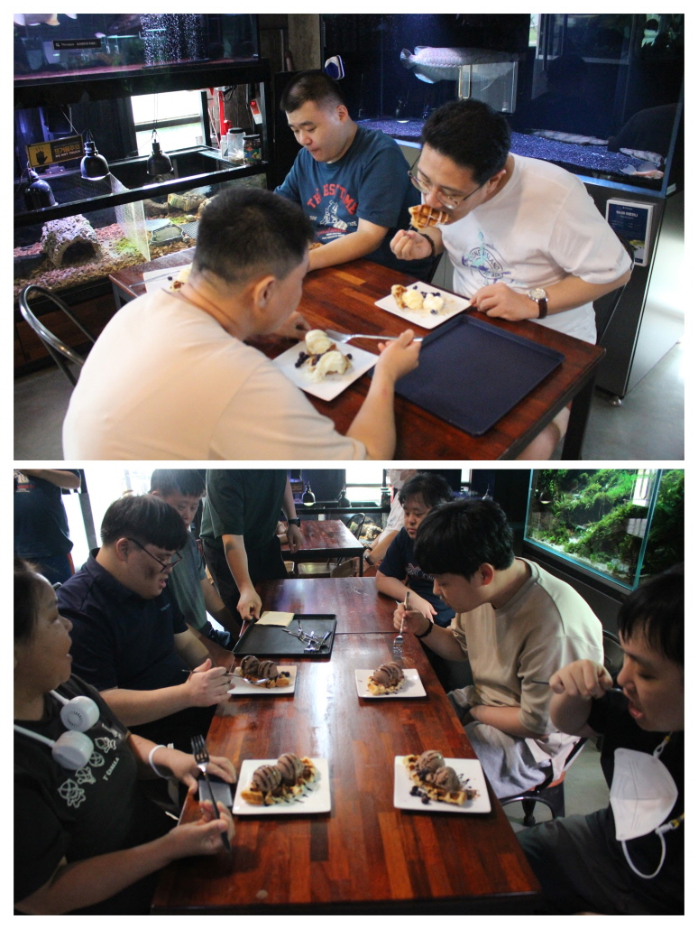 또한 시그니쳐 메뉴인 '아이스크림 크로플'을 직접 구매하여 먹으며, 물고기에 대해 이야기도 나누고, 여유롭게 수족관을 관찰하며 더운 여름, 시원한 곳에서 힐링하는 시간을 가져보았습니다.