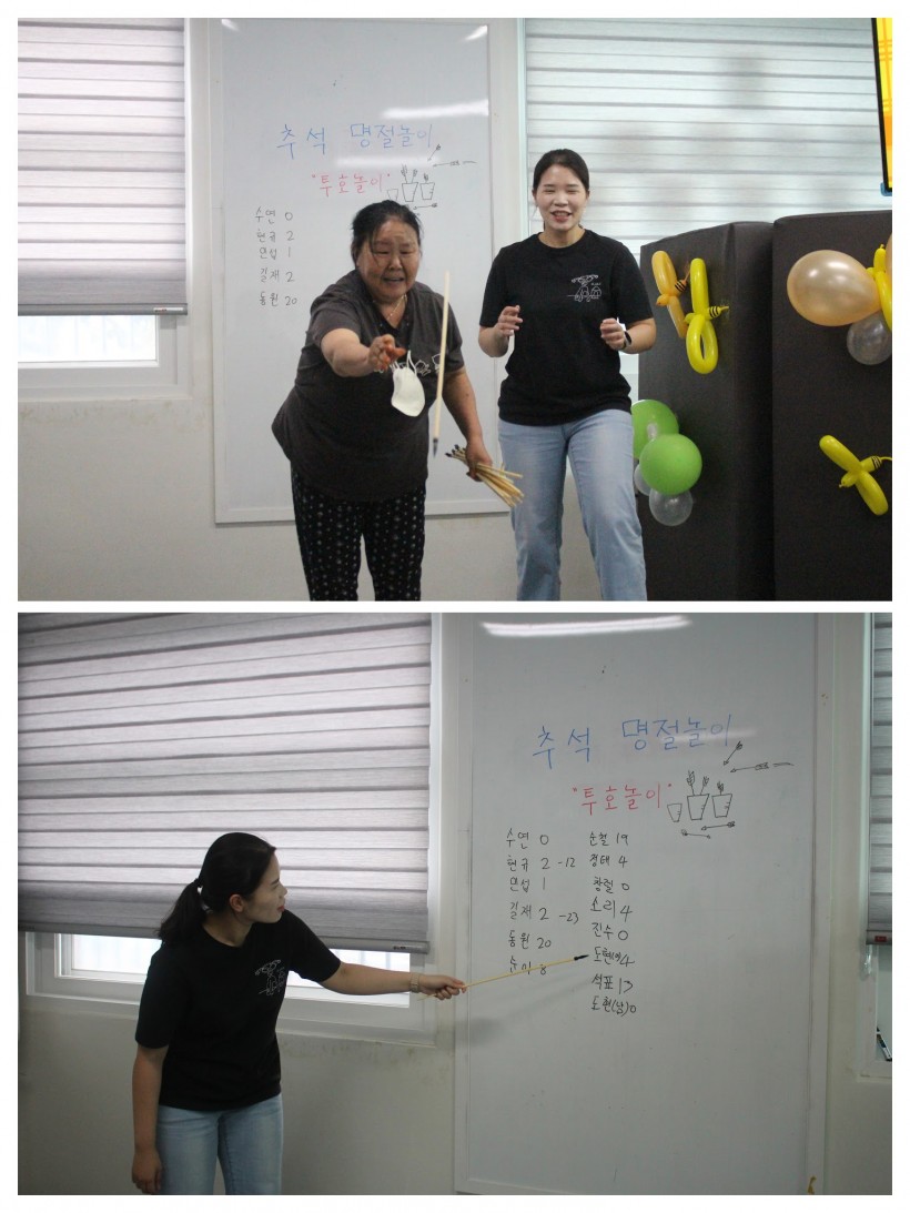 저희 센터에서는 추석 특별활동으로 신나는 민요를 들으며 투호놀이도 하고, 간식으로 추석의 대표 음식인 송편과 식혜를 먹는 시간을 가져보았습니다.