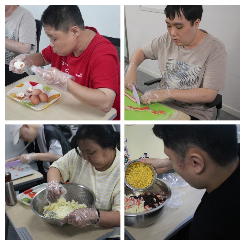 오후에는 구입한 재료를 가지고 요리활동을 하였는데 이용인의 활동능력에 따라 감자와 계란의 껍질을 제거한 후 으깨고, 맛살과 오이를 자르는 활동을 하는 그룹으로 나누어 활동하며 감자샌드위치를 만든 후 간식으로 맛있게 먹어 보았습니다.