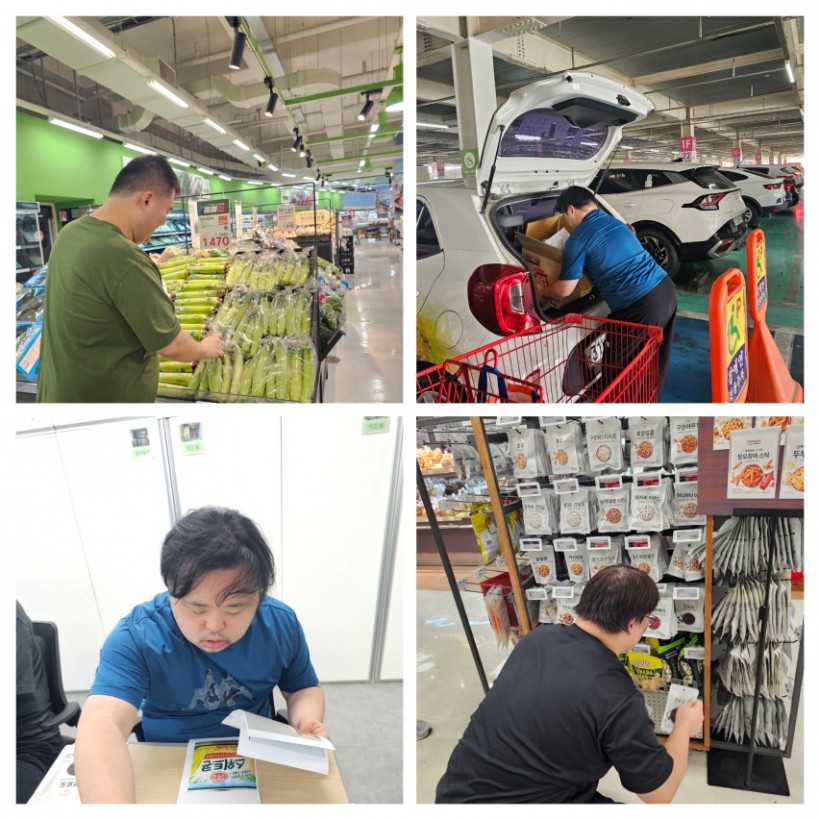 마트에 있는 다양한 재료에 관심을 보이며 사진과 같은 재료를 찾아 직접 카트에 넣기도 하고, 재료를 찾기 어려워하는 이용인은 교사가 재료가 있는 장소와 함께 이동해 직접 재료를 찾아보도록 하니 어렵지 않게 재료를 찾는 모습을 보였습니다.