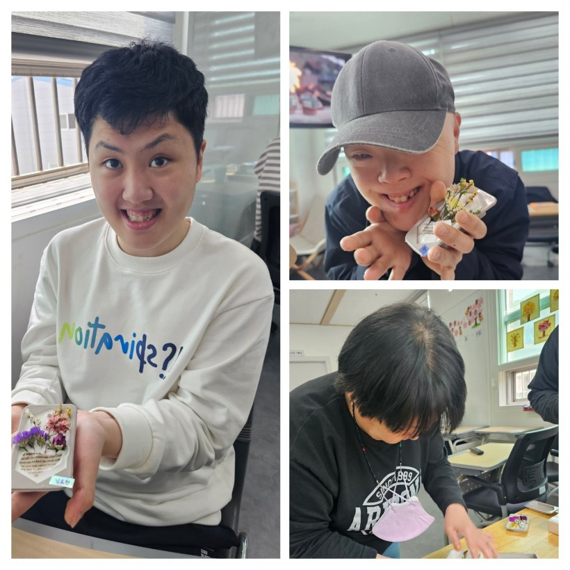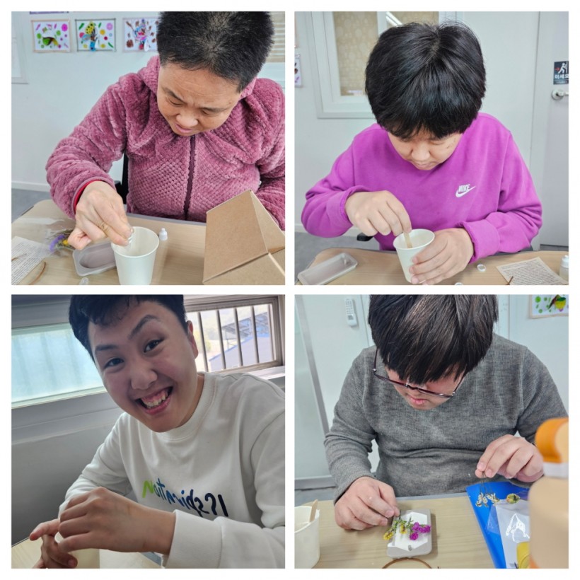 또한 석고가루에 물이 섞이면 빨리 굳어 버리는 특성이 있어 이용인과 교사가 1:1 로 매칭되어 드라이플라워 석고방향제를 만들어 보았고, 모든 재료를 섞은 후 드라이플라워를 장식하고 포장하기까지의 과정에 스스로 참여하며 만족해 하는 모습을 보였습니다.